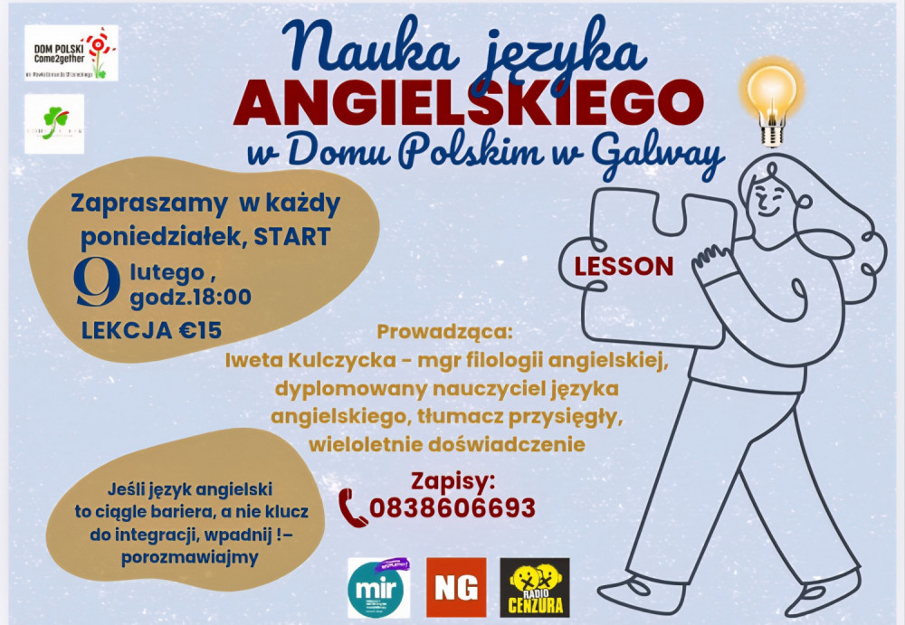 Od poniedziałku 9 lutego w Domu Polskim w Galway ruszają regularne, cotygodniowe spotkania z języka angielskiego od podstaw, prowadzone zgodnie z potrzebami uczestników.